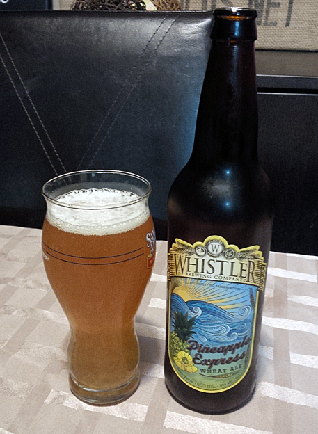 Whistler Brewing – Pineapple Express Wheat Ale: Brewed in Whistler, BC this wheat ale comes in at 5% alcohol, served in a glass from a 22 oz bottle at home.