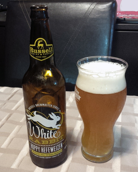 Russell Brewing – White Rabbit Hoppy Hefeweizen: Is a local Surrey brewed Hefeweizen at a strength of 6% abv that was enjoyed at home in a 22 oz beer glass.