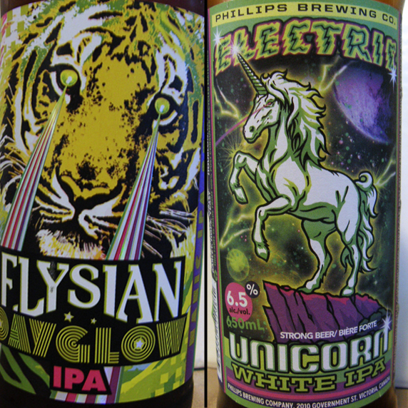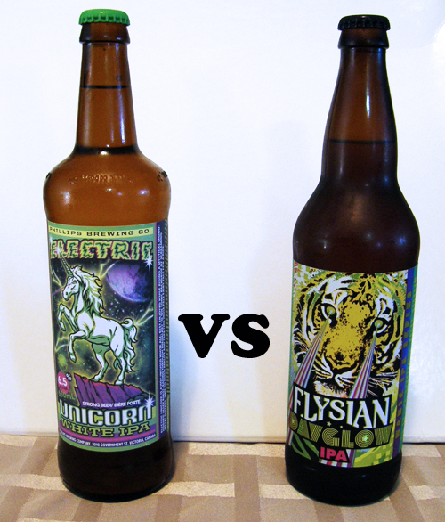 Which has the better bottle/label: I can’t even begin to pick a winner here, the psychedelic laser eyed Dayglow tiger is totally ferocious and bad ass, while the Electic Unicorn may not sound quite as tough, the fact that it too has laser eyes as well as electricity emanating from its body pretty much makes them equally awesome.