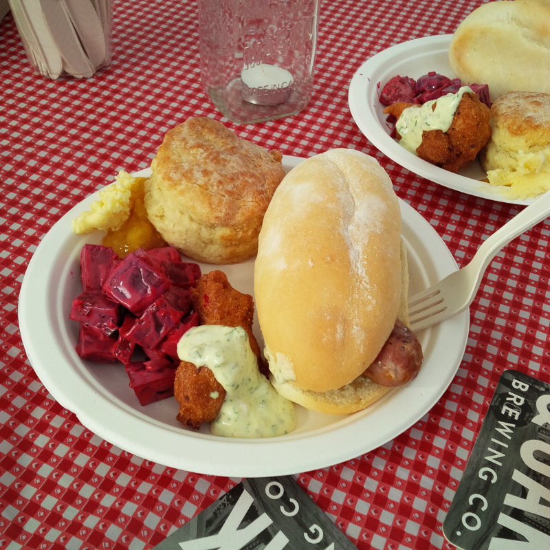 The food, heirloom beet salad, hush puppy, biscuit and “hot dog”